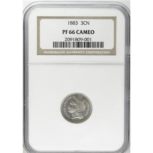 <B>1883 3CN PR66 Cameo NGC.</B></I> The light golden patina that appears on the obverse is absent on the reverse. Intricately detailed with plenty of contrast between the frosted devices and the deep mirrors.<BR><BR><b>Shipping:</b> Coin/Currency (<a target="_blank" href="http://www.heritageauctions.com/common/shipping.php">view shipping information</a>)