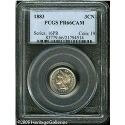<B>1883 3CN PR66 Cameo PCGS.</B></I> Just the lightest hint of golden color is present over each side of this immaculate Premium Gem three cent nickel. Nicely mirrored and problem-free. Lot:5822