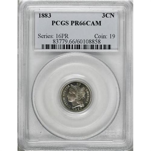 <B>1883 3CN PR66 Cameo PCGS.</B></I> A well-defined piece that offers mild, yet distinct contrast on each side. Though the minimally toned obverse is a trifle soft, the reverse offers bold detail. Population: 51 in 66 Cameo, 30 finer (3/08).<BR><BR><b>Shipping:</b> Coins & Currency (<a target="_blank" href="http://www.heritageauctions.com/common/shipping.php">view shipping information</a>)