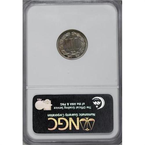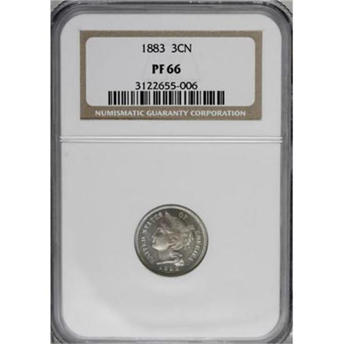 <B>1883 3CN PR66 NGC.</B></I> Subtle lavender-gray and champagne shadings drape the luminous mirrors of this odd-denomination Premium Gem. A pleasingly detailed specimen with elegant visual appeal.<BR><BR><B>Coin Engraver:</B> James B. Longacre<BR><BR><b>Shipping:</b> Coins & Currency (<a target="_blank" href="http://www.heritageauctions.com/common/shipping.php">view shipping information</a>)