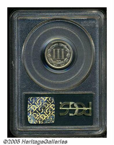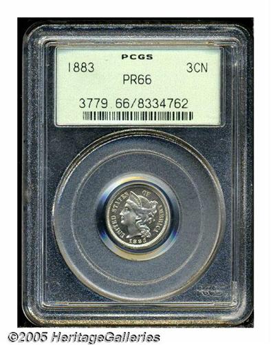 <B>1883<3CN> PR66 PCGS.</B></I> Wisps of pale olive color adorn this meticulously struck and pleasing premium Gem. The pristine fields show undeniable reflectivity, and the devices display moderate cameo contrast undesignated on the older generation holder.