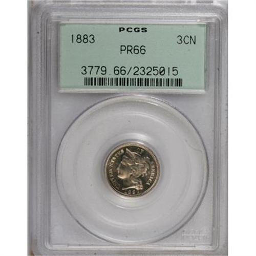 <B>1883 3CN PR66 PCGS.</B></I> PCGS Population (327/67). NGC Census: (273/81). Mintage: 6,609. Numismedia Wsl. Price for NGC/PCGS coin in PR66: $710. (#3779)<BR><BR><B>Coin Engraver:</B> James B. Longacre<BR><BR><b>Shipping:</b> Coins & Currency (<a target="_blank" href="http://www.heritageauctions.com/common/shipping.php">view shipping information</a>)