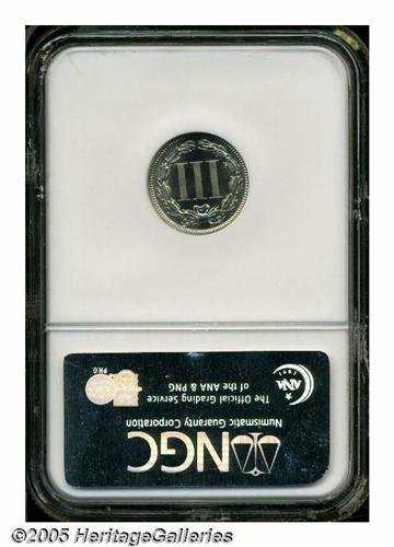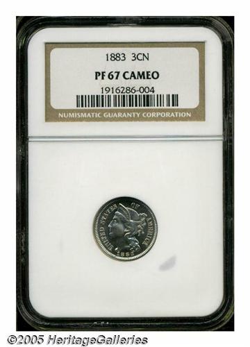 <B>1883<3CN> PR67 Cameo NGC.</B></I> A needle-sharp and essentially brilliant Superb Gem, lovingly preserved and with detectable white on black contrast. An outstanding representative of the proof type. Population: 14 in 67 Cameo, 1 finer (5/05).