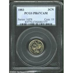 <TR><TD width="100%"><TABLE cellSpacing=1 cellPadding=3 width="100%" border=0><TBODY><TR><TD width="100%" bgColor=#79735c><FONT face=arial color=#ffffff size=3><B>Description</B> </FONT></TD></TR><TR><TD width="100%" bgColor=#ffffff><FONT face=arial size=2><B>1883 3CN PR67 Cameo PCGS.</B></I> Streaks of cherry-gold color invigorate the lower reverse, while the obverse is only lightly toned. A gorgeously preserved and expertly struck Superb Gem. A scarce type with good cameo contrast. Population: 14 in 67 as Cameo, 0 finer (4/03). </FONT></TD></TR></TBODY></TABLE></TD></TR></TBODY></TABLE><BR><A name=PricesRealized></A><TABLE cellSpacing=0 cellPadding=0 width="100%" bgColor=#000000 border=0><TBODY><TR><TD width="100%"><TABLE cellSpacing=1 cellPadding=3 width="100%" border=0><TBODY><TR><TD width="100%" bgColor=#79735c><A name=PR><FONT face=arial color=#ffffff size=3><B>Previous Prices from Heritage Auctions</B> </FONT></A></TD></TR><TR><TD bgColor=#f6f6ed><TABLE cellSpacing=0 cellPadding=0 width="100%" border=1><TBODY><TR><TD align=middle width="33%"><B>Date</B></TD><TD align=middle width="33%"><B>Service</B></TD><TD align=middle width="33%"><B>Price</B></TD></TR><TR bgColor=whitesmoke><TD width="33%"><B>01/11/2003</B></TD><TD width="33%">PCGS</TD><TD width="33%">$1,207.50</TD></TR><TR bgColor=whitesmoke><TD width="33%"><B>07/02/2002</B></TD><TD width="33%">PCGS</TD><TD width="33%">$1,495.00</TD></TR><TR bgColor=whitesmoke><TD width="33%"><B>11/15/2001</B></TD><TD width="33%">PCGS</TD><TD width="33%">$1,092.50</TD></TR><TR bgColor=whitesmoke><TD width="33%"><B>01/11/2003</B></TD><TD width="33%">NGC</TD><TD width="33%">$920.00</TD></TR><TR bgColor=whitesmoke><TD width="33%"><B>10/15/2002</B></TD><TD width="33%">NGC</TD><TD width="33%">$1,380.00</TD></TR><TR bgColor=whitesmoke><TD width="33%"><B>03/01/2003</B></TD><TD width="33%">PCGS</TD><TD width="33%">$1,265.00</TD></TR><TR bgColor=whitesmoke><TD width="33%"><B>05/31/2003</B></TD><TD width="33%">PCGS</TD><TD width="33%">$1,552.50</TD></TR></TBODY></TABLE></TD></TR><TR><TD bgColor=#ffffff><FONT face=arial size=1 ?>PLEASE NOTE: All prices realized reflect the final hammer price PLUS the buyer's premium in auctions that charge a buyer's premium. Each item has a notation at the top of the listing indicating whether that lot included a buyer's premium. Example: A item that sells with a final hammer price of $100 and a 20% buyer's premium will display with a price realized of $120. All information listed is intended to be as accurate as possible, but errors are possible. Please use this guide carefully and inform us of any inaccuracies. </FONT></TD></TR></TBODY></TABLE></TD></TR></TBODY></TABLE><BR><TABLE cellSpacing=0 cellPadding=0 width="100%" bgColor=#000000 border=0><TBODY><TR><TD width="100%"><TABLE cellSpacing=1 cellPadding=3 width="100%" border=0><TBODY><TR><TD width="100%" bgColor=#79735c colSpan=6><FONT face=arial color=#ffffff size=3><B>Price Guide*</B> </FONT></TD></TR><TR bgColor=#f6f6ed><TD align=middle><B>Grade</B> </TD><TD align=middle><B>Coin World<BR>(Trends)</B> </TD><TD align=middle><B>Numismedia<BR>Retail</B> </TD><TD align=middle><B>Numismedia<BR>Wholesale</B> </TD><TD align=middle><B>Coin<BR>Universe</B> </TD><TD align=middle><B>Heritage<BR>Value Index</B> </TD></TR><TR bgColor=#ffffff><TD align=middle>66</TD><TD align=right>---</TD><TD align=right>---</TD><TD align=right>---</TD><TD align=right>---</TD><TD align=right>---</TD></TR><TR style="FONT-WEIGHT: bold" bgColor=#cccfdd><TD align=middle>67</TD><TD align=right>---</TD><TD align=right>---</TD><TD align=right>---</TD><TD align=right>---</TD><TD align=right>---</TD></TR><TR bgColor=#ffffff><TD align=middle>68</TD><TD align=right>---</TD><TD align=right>---</TD><TD align=right>---</TD><TD align=right>---</TD><TD align=right>---</TD></TR><TR bgColor=#ffffff><TD colSpan=6><FONT size=1>*All information listed is intended to be as accurate as possible, but errors are possible. No item may be returned or refused based on this information which is provided as a service to our customers. You should contact each pricing source directly to determine the accuracy of this information. </FONT></TD></TR></TBODY></TABLE></TD></TR></TBODY></TABLE><BR><TABLE cellSpacing=0 cellPadding=0 width="100%" bgColor=#000000 border=0><TBODY><TR><TD width="100%"><TABLE cellSpacing=1 cellPadding=3 width="100%" border=0><TBODY><TR><TD width="100%" bgColor=#79735c><FONT face=arial color=#ffffff size=3><B>Population Guide</B> </FONT></TD></TR><TR bgColor=#ffffff><TD align=middle><!-- Begin Output of Population Grid--><TABLE cellSpacing=0 cellPadding=0 width="100%" border=0><TBODY><TR><TD vAlign=center><TABLE cellSpacing=0 width="100%" border=1 cellsadding="3"><TBODY><TR><TD vAlign=center><TABLE cellSpacing=0 cellPadding=3 width="100%" border=1><TBODY><TR><TD vAlign=center align=middle bgColor=#f0f1e8 colSpan=2 <CENTER><FONT face=Arial size=2><B>PCGS Pop </B></FONT><CENTER></CENTER></TD><TD vAlign=center align=middle bgColor=#f0f1e8 colSpan=2><CENTER><FONT face=Arial size=2><B>NGC Pop</B></CENTER></FONT></TD></TR><TR><TD vAlign=center><FONT face=Arial size=2>(67)</FONT> </TD><TD vAlign=center align=right><FONT face=Arial size=2>14</FONT> </TD><TD vAlign=center><FONT face=Arial size=2>(67)</FONT> </TD><TD vAlign=center align=right><FONT face=Arial size=2>6</FONT> </TD></TR><TR><TD vAlign=center><FONT face=Arial size=2>(>67)</FONT> </TD><TD vAlign=center align=right><FONT face=Arial size=2>0</FONT> </TD><TD vAlign=center><FONT face=Arial size=2>(>67)</FONT> </TD><TD vAlign=center align=right><FONT face=Arial size=2>1</FONT> </TD></TR></TBODY></TABLE></TD></TR></TBODY></TABLE></TD></TR></TBODY></TABLE><!-- End Output of Population Grid--></TD></TR></TBODY></TABLE></TD></TR></TBODY></TABLE><BR><TABLE cellSpacing=0 cellPadding=0 width="100%" bgColor=#000000 border=0><TBODY><TR> Important notice: We expect to be auctioning lots at the rate of 200-250 per hour. On occasion eBay live bid software cannot keep up