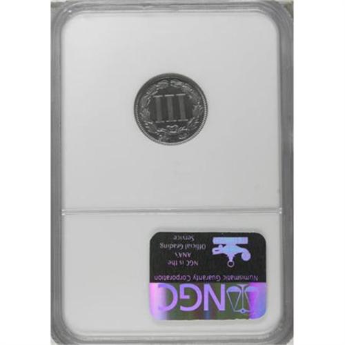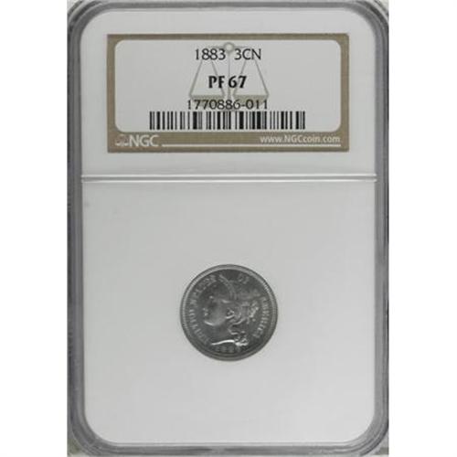 <B>1883 3CN PR67 NGC.</B></I> The 1883 proof three cent nickel issue is noted as the first of several which had mintages exceeding those of the business strikes with the same date. Delicate blue-green and periwinkle patina graces both sides of this enticing Superb Gem specimen. NGC has graded only five fiver pieces (8/07).<BR><BR><B>Coin Engraver:</B> James B. Longacre<BR><BR><b>Shipping:</b> Coins & Currency (<a target="_blank" href="http://www.heritageauctions.com/common/shipping.php">view shipping information</a>)