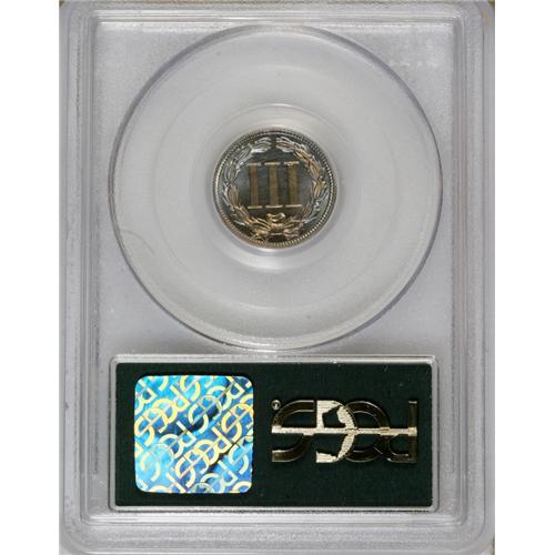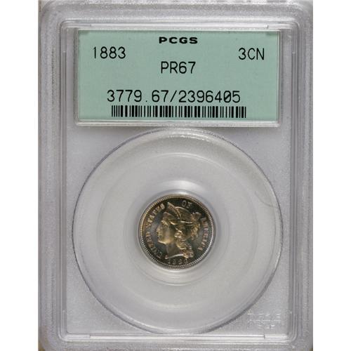 <B>1883 3CN PR67 PCGS.</B></I> Iridescent powder-blue, gold, and peach shades endow this decisively struck and satiny Superb Gem. An aesthetic prize for the connoisseur. Housed in an old green label holder. Population: 63 in 67, 4 finer (2/07).<BR><BR><b>Shipping:</b> Coins & Currency (<a target="_blank" href="http://www.heritageauctions.com/common/shipping.php">view shipping information</a>)