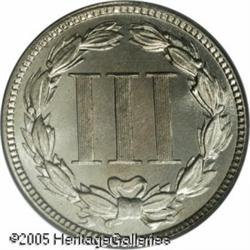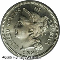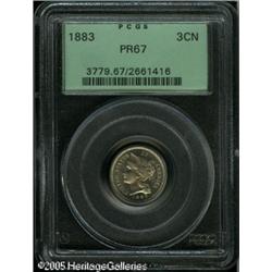 <B>1883 3CN PR67 PCGS.</B></I> Wisps of champagne toning add to the eye appeal of this Superb Gem example. The fields are reflective with satiny luster, and they contrast with the lustrous devices. It is a sharply struck example, and nearly the finest certified. Population: 62 in 67, 4 finer (1/05). Lot:5821