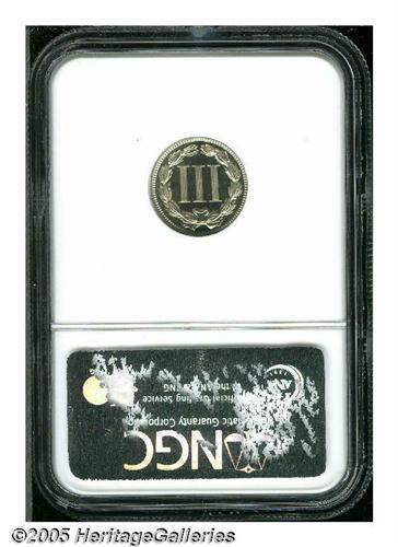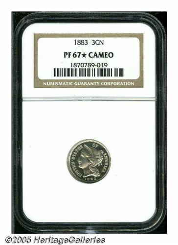 <B>1883<3CN> PR67 <S Cameo NGC.</B></I> Exceptional surfaces with dark fields and nicely frosted, well struck devices. Virtually flawless save only for some tiny shifts in the frosting. Population: 1 in 67 <S, 1 finer without the <S designation (6/05).
