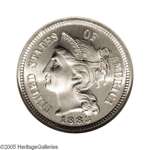 <B>1883<3CN> PR68 NGC.</B></I> Sparkling proof brilliance with no spotting, no hairlines, and appealing field-to-device contrast. Both sides are snow-white and virtually perfect as would be expected of the grade. To date (11/04), only six other pieces have been certified Proof 68 by both services combined. It would be hard to imagine a finer example.