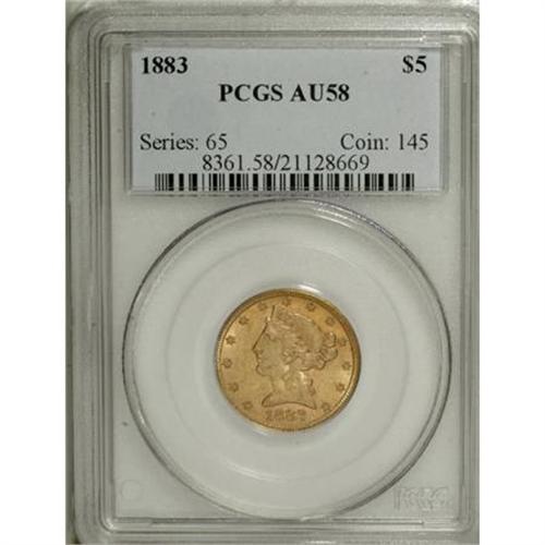 <B>1883 $5 AU58 PCGS.</B></I> PCGS Population (20/145). NGC Census: (64/248). Mintage: 233,461. Numismedia Wsl. Price for NGC/PCGS coin in AU58: $215. (#8361)<BR><BR><B>Coin Engraver:</B> Christian Gobrecht<BR><BR><b>Shipping:</b> Coins & Currency (<a target="_blank" href="http://www.heritageauctions.com/common/shipping.php">view shipping information</a>)