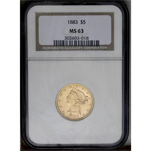 <B>1883 $5 MS63 NGC.</B></I> The lovely peach and mint-green surfaces reveal nicely struck features and slightly weak luster. Small, superficial marks are clustered in the obverse and reverse fields. A scarce date in all Mint State grades. Census: 29 in 63, 21 finer (12/05).