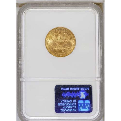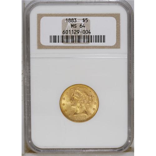 <B>1883 $5 MS64 NGC.</B></I> A sharply struck and highly lustrous yellow-gold near-Gem that has peach accents in the fields. Scattered marks on the obverse account for the grade. Census: 19 in 64, 3 finer (10/06).<BR><BR><b>Shipping:</b> Coin/Currency (<a target="_blank" href="http://www.heritageauctions.com/common/shipping.php">view shipping information</a>)