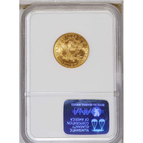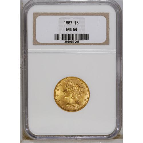 <B>1883 $5 MS64 NGC.</B></I> A vivid bright yellow example of this conditionally scarce P mint from the 1880s. One can hardly imagine a stronger strike than found on this beautiful half eagle Census: 19 in 64, 3 finer (10/06).<BR><BR><b>Shipping:</b> Coin/Currency (<a target="_blank" href="http://www.heritageauctions.com/common/shipping.php">view shipping information</a>)