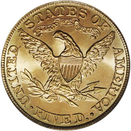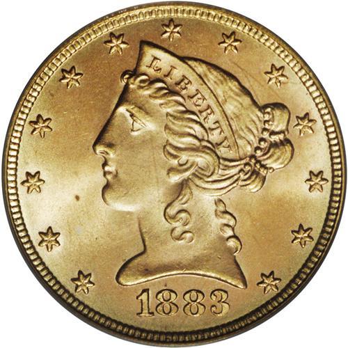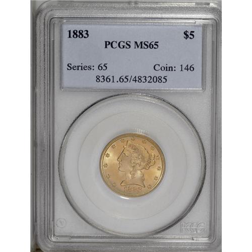 <B>1883 $5 MS65 PCGS.</B></I> Trumped only by an NGC Superb Gem offered at the November 2004 Palm Beach sale, this example is the second-finest of this issue ever offered by Heritage. The devices are sharply detailed, and the lustrous yellow-gold obverse has hints of reddish-orange in the fields. Only a few incidental marks appear on each side, though among these is a mark on Liberty's chin. Population: 2 in 65, 0 finer (10/06).<BR><I>From The Cocoa Beach Collection.</B></I><BR><BR><b>Shipping:</b> Coin/Currency (<a target="_blank" href="http://www.heritageauctions.com/common/shipping.php">view shipping information</a>)