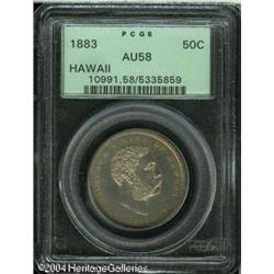1883 50C Hawaii Half Dollar AU58 PCGS. Luminous go <B>1883 50C Hawaii Half Dollar AU58 PCGS.</B></I> Luminous golden-brown and gunmetal-gray patina graces this unmarked and virtually Mint State example. A sharply struck and pleasing representative of this scarce denomination. <BR><BR><B>Important notice:</B> Heritage usually auctions material at the rate of 200-250 lots per hour. On some occasions eBay Live bid software or the Internet may not be able to keep up with the pace of the auction. We recommend placing a realistic absentee bid now as insurance to avoid disappointment. Occasionally the auctioneer may eliminate or reject an eBay Live bid, and the auctioneer may also reopen a lot after the close of the eBay live bidding (usually because we missed an audience bid), and may reject your bid even if it shows you as the winning bidder. By bidding via eBay Live, you agree that Heritage may award the lot to another bidder at its sole discretion under the circumstances described above or any other reasonable circumstances. Since eBay bids are not shown to us until we open the lot on the floor, we treat those bids just like floor bids. In most cases the floor responds before the eBay bid is presented to us, due to Internet lag time, so for consistency we have made it a policy that floor bids are always considered first over tie eBay live bids. Also please note that all Heritage lots purchased through eBay Live carry a 20% Buyer's Premium. Please make sure you read the Terms and Conditions before you bid. This lot is being auctioned in conjunction with a live floor auction by Heritage Galleries & Auctioneers. All final auction and invoice information will be supplied by Heritage Galleries & Auctioneers, and all other information should be considered preliminary. Lot:8014