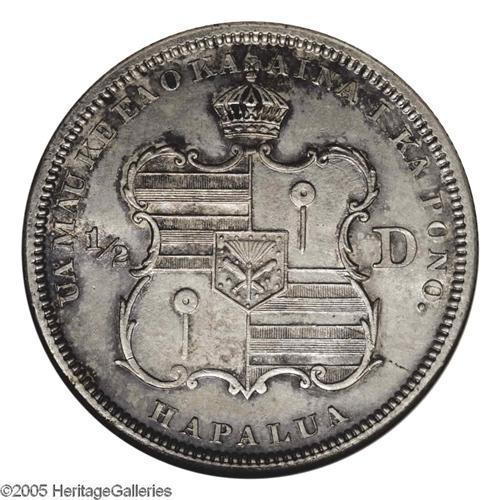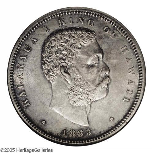 <B>1883<50C> Hawaii Half Dollar MS60 ANACS.</B></I> From a scarcer Hawaiian denomination, this piece exhibits moderate steel-gray color and a good strike. The luster is muted and a few scattered marks serve to limit the grade.