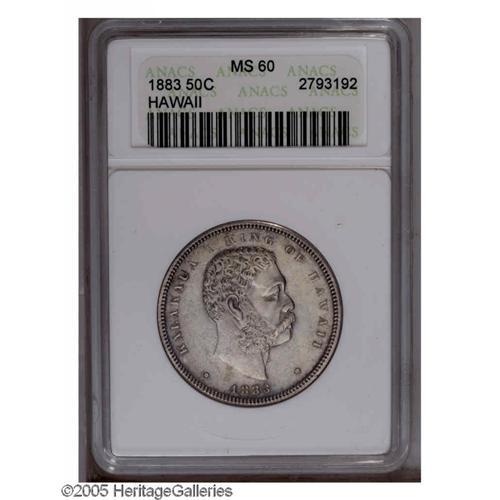 1883 50C Hawaii Half Dollar MS60 ANACS. From a scarcer 1883[50C] Hawaii Half Dollar MS60 ANACS.
