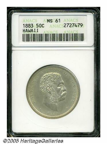 <B>1883<50C> Hawaii Half Dollar MS61 ANACS.</B></I> From a scarcer Hawaiian denomination, this piece exhibits pale chestnut-gold color and a good strike. The luster is extensive although not effusive.