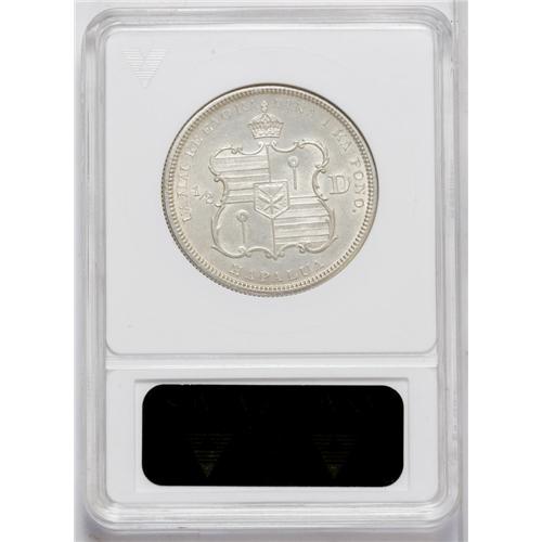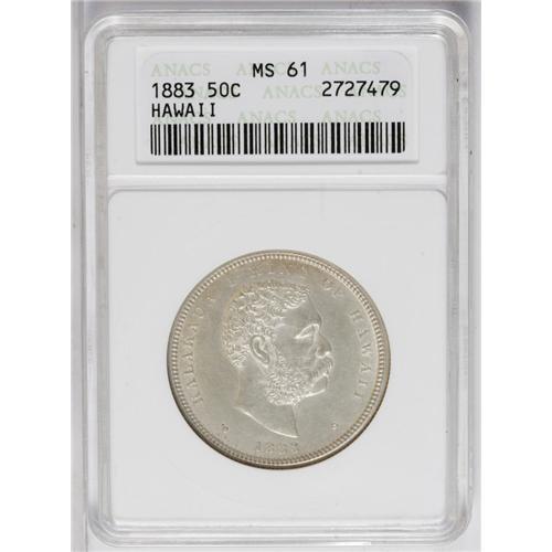 <B>1883<50C> Hawaii Half Dollar MS61 ANACS.</B></I> From a scarcer Hawaiian denomination, this piece exhibits pale chestnut-gold hues and a good strike. The luster is extensive although not effusive.
