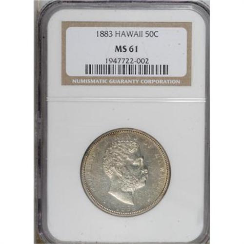 <B>1883 50C Hawaii Half Dollar MS61 NGC.</B></I> Delicate tan toning graces this well struck hapalua. The reverse is minimally abraded, while the obverse has its share of individually small marks.<BR><BR><b>Shipping:</b> Coins & Currency (<a target="_blank" href="http://www.heritageauctions.com/common/shipping.php">view shipping information</a>)
