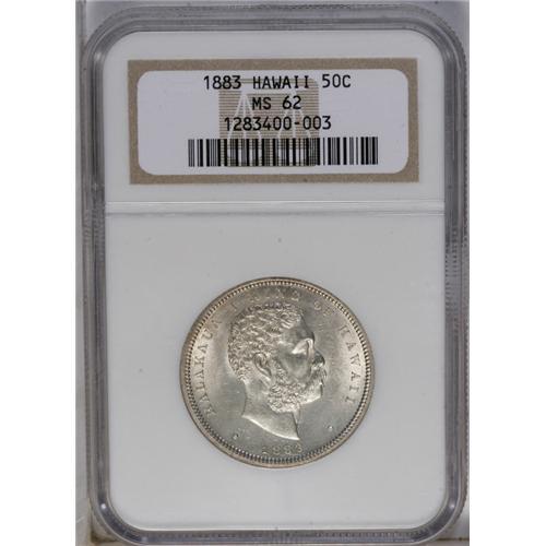 <B>1883<50C> Hawaii Half Dollar MS62 NGC.</B></I> Well struck, highly lustrous, and essentially untoned, save for a few small touches of apricot color on the lower reverse. The surfaces are nicely preserved, for the grade, but have a number of small, scattered contact marks on each side.