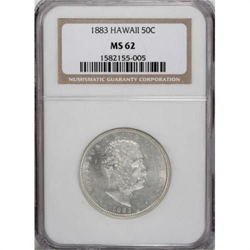 <B>1883 50C Hawaii Half Dollar MS62 NGC.</B></I> Despite its status as the highest-mintage Hawaii denomination of 1883, the half dollar is considerably less available than the quarter, particularly in Mint State. This crisply struck silver-white example shines beneath minor, gauzy haze over the reverse fields. Small, scattered abrasions account for the grade.<BR><BR><b>Shipping:</b> Coins & Currency (<a target="_blank" href="http://www.heritageauctions.com/common/shipping.php">view shipping information</a>)