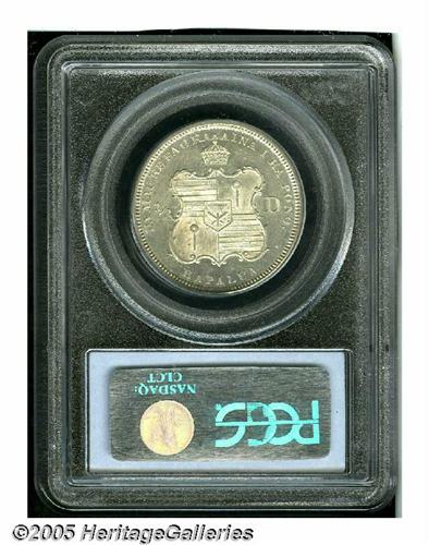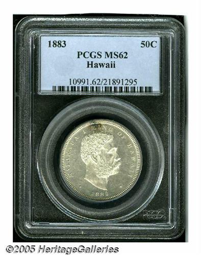 <B>1883<50C> Hawaii Half Dollar MS62 PCGS.</B></I> Semi-reflective overall, this is a sharply struck, essentially untoned example. A few scattered abrasions seem to account for the grade. A single dark toning spot is seen at the top of the obverse.