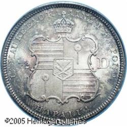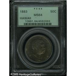 <B>1883 50C Hawaii Half Dollar MS64 PCGS.</B></I> Medium density steel-blue and peach toning forms swirling layers over both sides. Contact marks are made less noticeable by the toning and tend to be concentrated on the obverse. One of several outstanding Hawaii Halves in the sale and a coin that is far more difficult than multiple offerings might suggest. To illustrate just how scarce this issue is in MS64 and higher grade, there have been over 1,200 examples of the highly regarded 1928 Hawaiian Half Dollar certified by PCGS, yet only 40 of the "Hapaluas" have attained this grade level at PCGS. Lot:10782