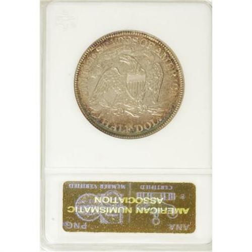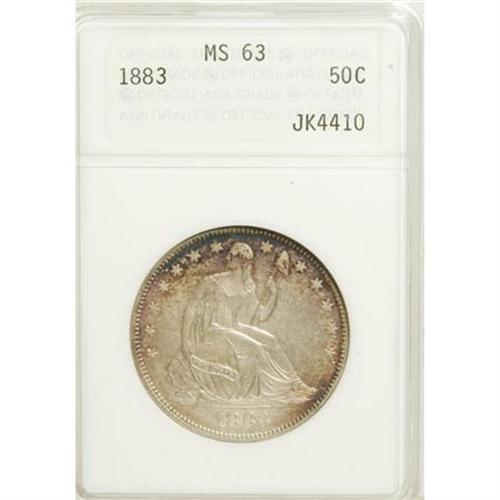 <B>1883 50C MS63 ANACS.</B></I> Autumn-brown and cobalt-blue shades deepen toward the rims. The strike is good save for softness on Liberty's hair. A scant 8,000 commercial pieces were struck. Encased in an ANA cache holder.<BR><BR><B>Coin Engraver:</B> Christian Gobrecht<BR><BR><b>Shipping:</b> Coins & Currency (<a target="_blank" href="http://www.heritageauctions.com/common/shipping.php">view shipping information</a>)