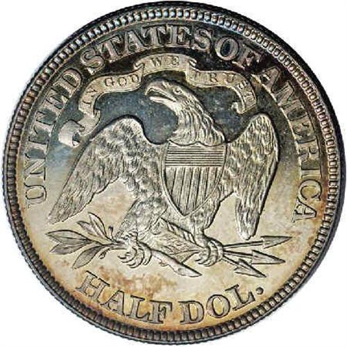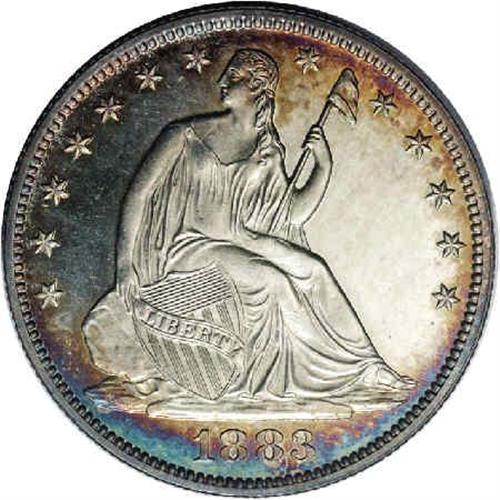 <B>1883<50C> PR64 Cameo NGC.</B></I> An appealing proof, with golden, purple-red, and electric-blue toning at the rims and in some of the fields. The fields are deeply mirrored and the devices partially frosted, yielding a strong Cameo effect. This coin is an exceptional survivor of a late date Seated Half issue, that saw just 8,000 business strikes and 1,039 proofs. Population: 14 in 64 Cameo, 15 finer in Cameo condition (9/05).