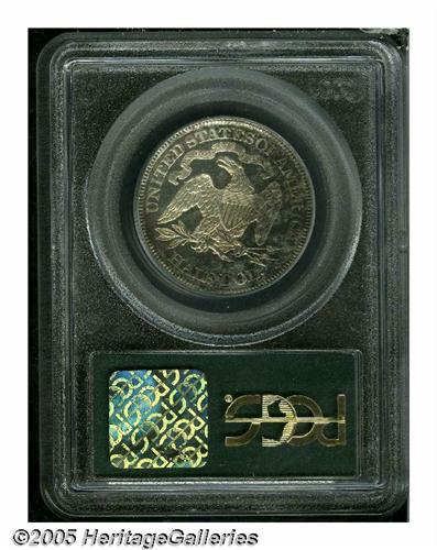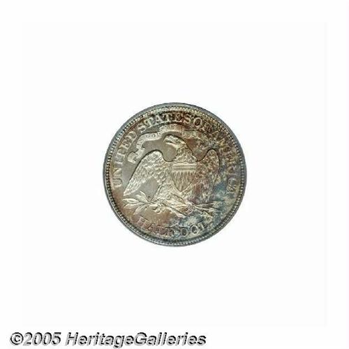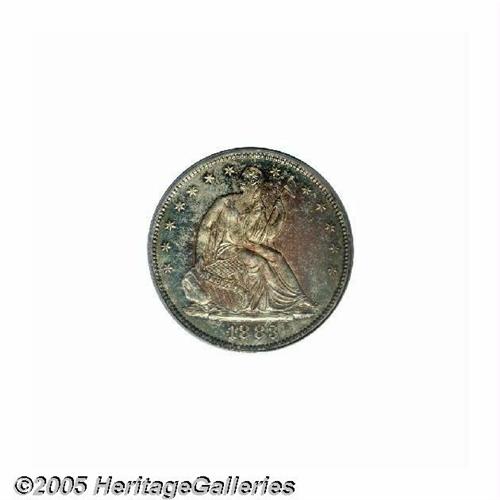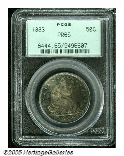 <B>1883<50C> PR65 PCGS.</B></I> The Philadelphia Mint was the only coinage facility that produced half dollars in 1883, and a minuscule total of 9,039 pieces were struck. A high grade survivor of the proof delivery (1,039 pieces), this coin displays a mix of golden-brown, mauve, lime-green, lavender, and aqua patina over somewhat reflective fields and mildly frosted motifs. Every detail shows a bold effect. A small indention on Liberty's cheek is mentioned for accuracy. Our auction records show that this issue has made only 26 appearances in this grade level through the major houses in the last fifteen years, with 17 pieces grading higher. Population: 33 in 65, 9 finer (5/05).