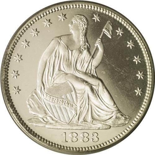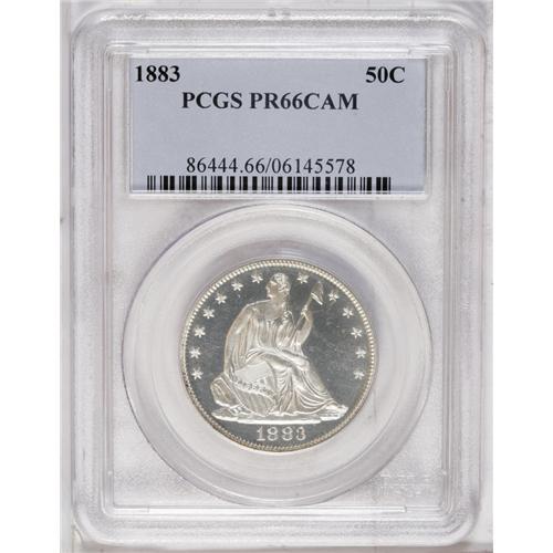 <B>1883<50C> PR66 Cameo PCGS.</B></I> A stunning and Premium Gem with deeply mirrored fields and nice cameo contrast. The devices are highly lustrous, and the entire coin is brilliant with fully white-silver surfaces. Among 19th-century proof silver coins, and we have seen many over our years of experience, this is among the finest that we can recall. This is truly a coin for the connoisseur, one which will grace any collection. Population: 10 in 66 Cameo, 1 finer (7/06).