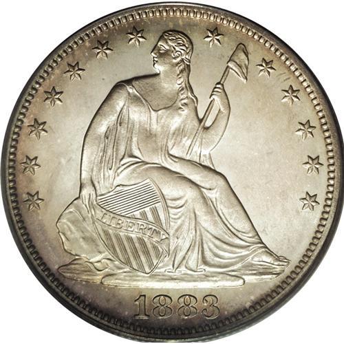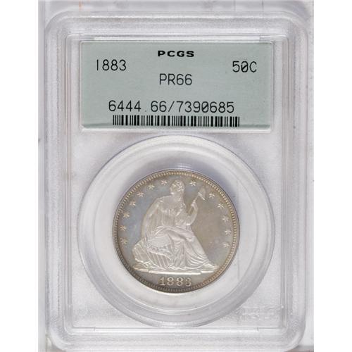 <B>1883<50C> PR66 PCGS.</B></I> The Philadelphia Mint was the only coinage facility that produced half dollars in 1883, and a minuscule total of 9,039 pieces (including proofs) were struck. A high grade survivor of the proof issue (1,039 pieces), this is a lovely coin with creamy surfaces that show somewhat reflective fields and obverse peripheral shades of smoky-golden. The reverse is more deeply toned with smoky-gray and sea-green colorations. Every detail shows a bold effect and there are no readily seen marks anywhere on this beautiful coin. The population statistics confirm the scarcity of this proof coin in Gem Mint State. PCGS has certified a mere eight pieces in PR66; only one has been graded finer (6/06).