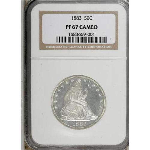 <B>1883 50C PR67 Cameo NGC.</B></I> Frosty devices provide ready contrast with the reflective fields. This unblemished Superb Gem is crisply struck and attractive. 1883 was another low mintage date, with proofs and business strikes combined limited to fewer than 10,000 pieces. Census: 2 in 67 Cameo, 2 finer (11/07).<BR><BR><b>Shipping:</b> Coins & Currency (<a target="_blank" href="http://www.heritageauctions.com/common/shipping.php">view shipping information</a>)