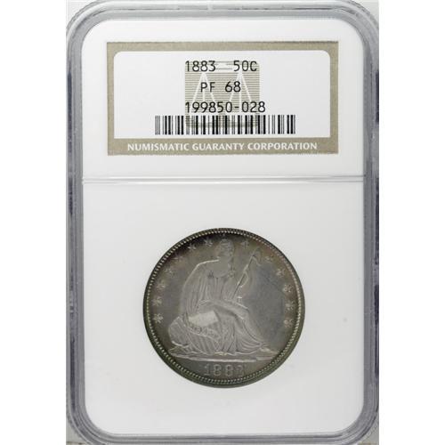 <B>1883 50C PR68 NGC.</B></I> Proof 1883 Seated half dollars, with an original mintage of 1,039 pieces, are generally available, as attested to by the few hundred that have been certified by NGC and PCGS. Full Gem examples, however, are challenging, and better-condition coins are rare. In PR68, the level of preservation of the specimen in this sale, a mere three examples have been seen, all by NGC, and none finer at either service. Immaculately preserved surfaces are visited by whispers of sky-blue and lavender around the margins, and hints of light beige in the centers. The motifs are boldly struck and lightly frosted, and stand apart from the deeply mirrored fields. This piece displays outstanding eye appeal throughout.<BR><BR><b>Shipping:</b> Coin/Currency (<a target="_blank" href="http://www.heritageauctions.com/common/shipping.php">view shipping information</a>)