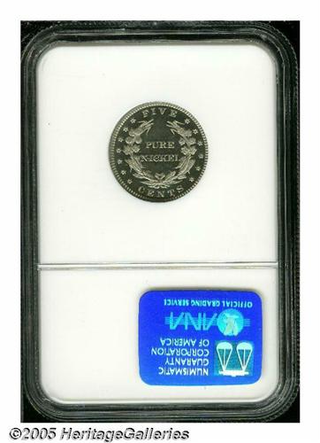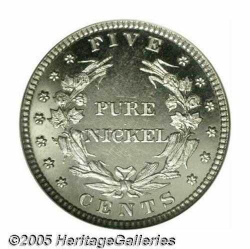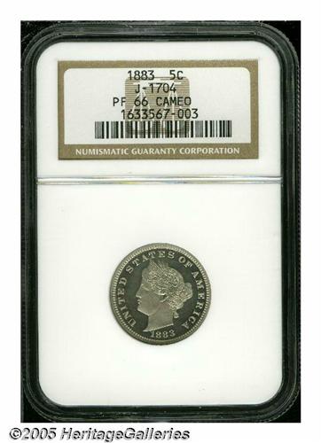 <B>1883<5C> Liberty Head Five Cents, Judd-1704, Pollock-1908, Low R.6, PR66 Cameo NGC.</B></I> The obverse is similar in design to the Liberty Nickel adopted in this year, except the stars are replaced with the legend UNITED STATES OF AMERICA. The reverse has a central inscription that reads PURE NICKEL, surrounded by a wreath of cotton and corn. FIVE CENTS is separated above and below with seven stars left and six right. Struck in nickel with a plain edge. This glassy, well contrasted specimen is untoned and boasts excellent contrast.<BR><I>From The Western Hills Collection.</B></I>