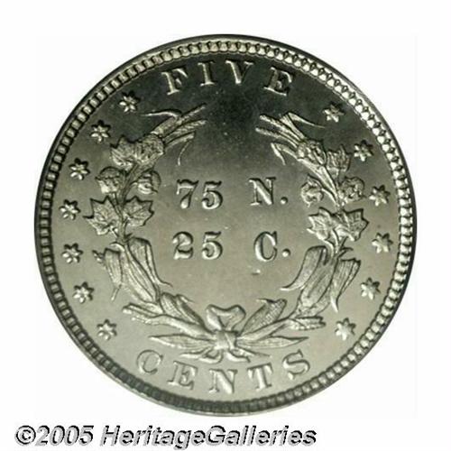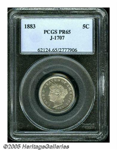 <B>1883<5C> Liberty Head Five Cents, Judd-1707, Pollock-1911, Low R.6, PR65 PCGS.</B></I> The central obverse device is similar to the head of Liberty adopted on the regular issue five-cent pieces of this year, the date is below, with UNITED STATES OF AMERICA around the margin. The reverse shows the experimental nature of this pattern with 75 N./25 C. in the center, surrounded by a wreath of cotton and corn, FIVE on the upper border, CENTS on the lower border, with thirteen stars arranged seven left and six right at the margin. Struck in a magnetic alloy of 75% nickel and 25% copper with a plain edge. Well mirrored with appreciable contrast and the slightest tinge of coppery color.<BR><I>From The Western Hills Collection.</B></I>