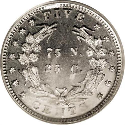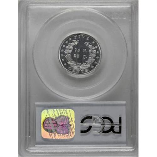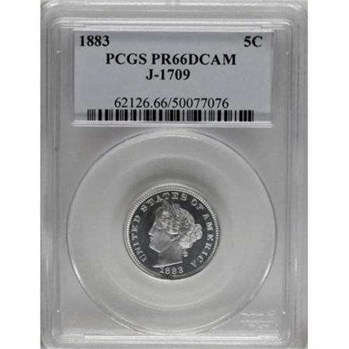 <B>1883 5C Liberty Head Five Cents, Judd-1709, Pollock-1913, Low R.7, PR66 Deep Cameo PCGS.</B></I> Charles Barber's head of Liberty faces left, the date below, and UNITED STATES OF AMERICA at the margin. The reverse indicates the use of experimental dies with 75 N./25 C. in the center, surrounded by a wreath of cotton and corn, FIVE CENTS at the top and bottom margins with seven stars left and six right. Struck in aluminum with a plain edge. Several patterns from this year use different nickel and copper alloys. Only about a half dozen pieces are known in aluminum. This is a superior coin that shows no oxidation on either side. The fields are deeply mirrored, as one would expect, and the devices heavily frosted.<BR><BR><b>Shipping:</b> Coins & Currency (<a target="_blank" href="http://www.heritageauctions.com/common/shipping.php">view shipping information</a>)