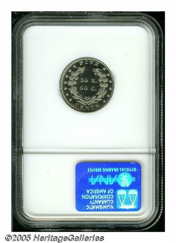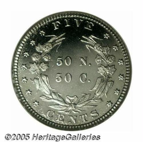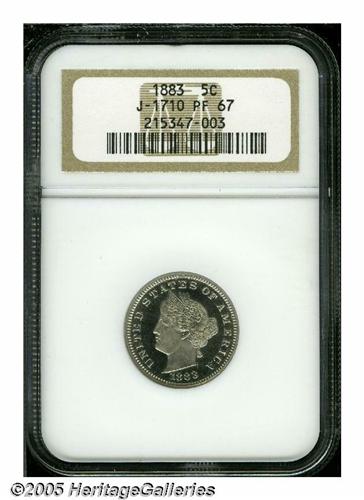 <B>1883<5C> Liberty Head Five Cents, Judd-1710, Pollock-1914, R.5, PR67 NGC.</B></I> The obverse is similar to that used on regular issue 1883 Liberty nickels, but the legend UNITED STATES OF AMERICA has been substituted for 13 stars around the periphery. The reverse is inscribed with 50 N. 50C. centered within a wreath of corn and cotton. FIVE is above, CENTS is below. Struck in nickel with a plain edge. A bright, boldly cameoed example, the surfaces are free of all but the most trivial blemish. Well struck, and a significant find for either the pattern collector or nickel specialist.<BR><I>From The Western Hills Collection.</B></I>