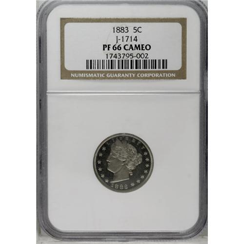 <B>1883<5C> Liberty Head Five Cents, Judd-1714, Pollock-1919, Low R.6, PR66 Cameo NGC.</B></I> Similar to the No Cents Liberty nickel regular issue of 1883, but LIBERTY is not present on the coronet. Instead, the legend is spread across the upper obverse margin. The stars are also smaller, and are arranged 6x7. Struck in nickel with a plain edge. This remarkably smooth Premium Gem has lovely pastel apricot and sky-blue tints. A thin retained lamination above the bust tip is noted as a pedigree marker.