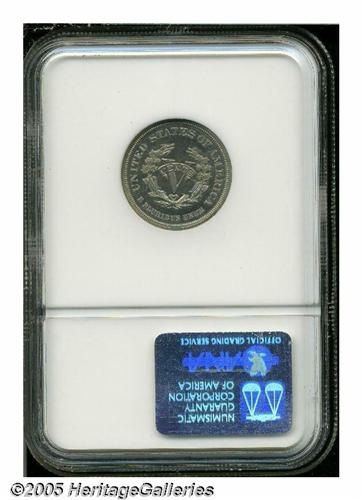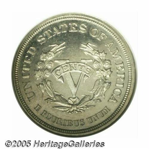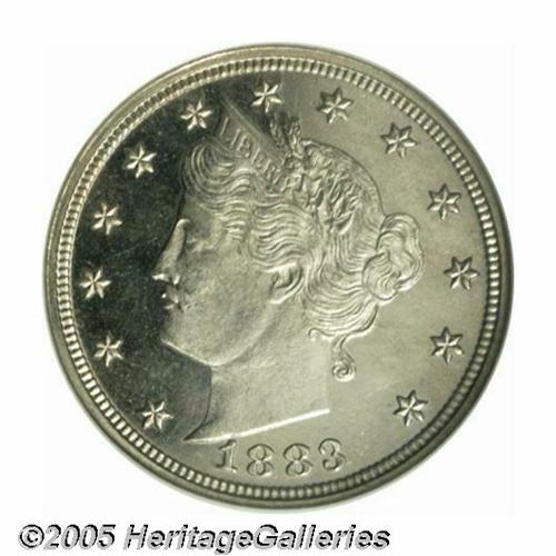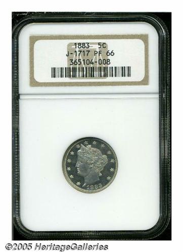 <B>1883<5C> Liberty Head Five Cents, Judd-1717, Pollock-1922, High R.6, PR66 NGC.</B></I> The obverse is identical to regular issue Liberty Nickels, and the reverse is similar to the adopted design, but the Roman numeral V is slightly smaller with a scroll across it inscribed CENTS. This was an added feature that was left off the adopted design, but changed later in the year to deter unscrupulous people that reeded the edges, gold plated the coins (without CENTS), and passed them off as Half Eagles. Struck in nickel with a plain edge. This well mirrored specimen is endowed with an exacting strike and is layered in milky patina that is heavier on the reverse.<BR><I>From The Western Hills Collection.</B></I>