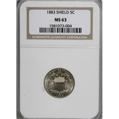 <B>1883 5C MS63 NGC.</B></I> NGC Census: (215/725). PCGS Population (352/719). Mintage: 1,456,919. Numismedia Wsl. Price for NGC/PCGS coin in MS63: $152. (#3813)<BR><BR><B>Coin Engraver:</B> James B. Longacre<BR><BR><b>Shipping:</b> Coins & Currency (<a target="_blank" href="http://www.heritageauctions.com/common/shipping.php">view shipping information</a>)