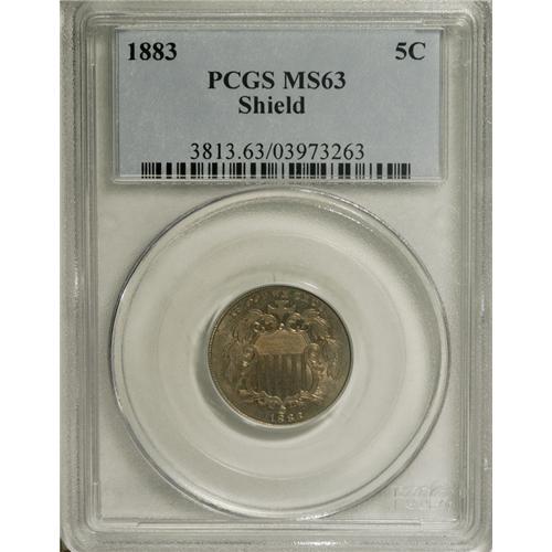 <B>1883 5C MS63 PCGS.</B></I> PCGS Population (341/700). NGC Census: (210/721). Mintage: 1,456,919. Numismedia Wsl. Price: $152. (#3813)<BR><BR><b>Shipping:</b> Coins & Currency (<a target="_blank" href="http://www.heritageauctions.com/common/shipping.php">view shipping information</a>)