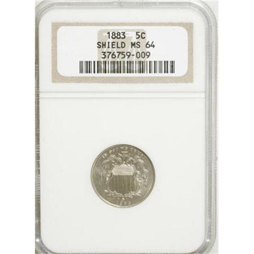 <B>1883 5C MS64 NGC.</B></I> NGC Census: (369/360). PCGS Population (430/309). Mintage: 1,456,919. Numismedia Wsl. Price for NGC/PCGS coin in MS64: $260. (#3813)<BR><BR><B>Coin Engraver:</B> James B. Longacre<BR><BR><b>Shipping:</b> Coins & Currency (<a target="_blank" href="http://www.heritageauctions.com/common/shipping.php">view shipping information</a>)