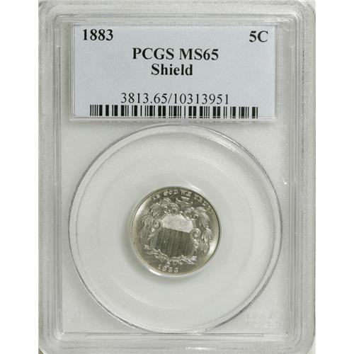 <B>1883 5C MS65 PCGS.</B></I> A lustrous and delicately patinated Gem from the final year of the series. Sharply struck, and the obverse is well preserved, while the reverse has only unimportant contact.<BR><BR><b>Shipping:</b> Coins & Currency (<a target="_blank" href="http://www.heritageauctions.com/common/shipping.php">view shipping information</a>)