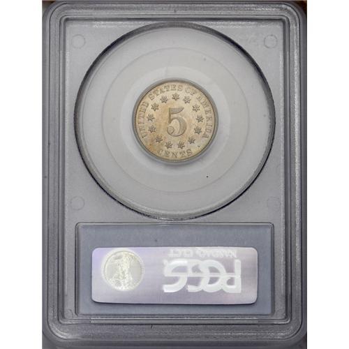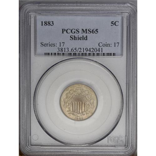 <B>1883<5C> MS65 PCGS.</B></I> Golden-brown centers cede to lighter olive-tinged borders. A lustrous and nicely struck final year shield nickel, whose only defect is a small mint-made strike-through above the N in CENTS. <BR><BR><B>Important notice:</B> Heritage usually auctions material at the rate of 200-250 lots per hour. On some occasions eBay Live bid software or the Internet may not be able to keep up with the pace of the auction. We recommend placing a realistic absentee bid now as insurance to avoid disappointment. Occasionally the auctioneer may eliminate or reject an eBay Live bid, and the auctioneer may also reopen a lot after the close of the eBay live bidding (usually because we missed an audience bid), and may reject your bid even if it shows you as the winning bidder. By bidding via eBay Live, you agree that Heritage may award the lot to another bidder at its sole discretion under the circumstances described above or any other reasonable circumstances. Since eBay bids are not shown to us until we open the lot on the floor, we treat those bids just like floor bids. In most cases the floor responds before the eBay bid is presented to us, due to Internet lag time, so for consistency we have made it a policy that floor bids are always considered first over tie eBay live bids. Also please note that all Heritage lots purchased through eBay Live carry a 20% Buyer's Premium. Please make sure you read the Terms and Conditions before you bid. This lot is being auctioned in conjunction with a live floor auction by Heritage Galleries & Auctioneers. All final auction and invoice information will be supplied by Heritage Galleries & Auctioneers, and all other information should be considered preliminary. Lot:870 <BR><BR><B>Winning Notification and Billing:</B> After the FINAL session in this auction is complete, Heritage will send e-mail and snail mail invoices. This process normally takes several days. All final auction and invoice information will be supplied by Heritage Galleries & Auctioneers, and all other information should be considered preliminary. <BR><BR>This auction will be conducted on a live auction floor and over the Internet through eBay Live. If you choose to place an absentee bid, please take a moment to <font color='#0000ff'><u><a href='http://pages.ebay.com/liveauctions/help/before/laabsentee.html'>learn how eBay Live absentee bidding works</a></u></font><font color='#000000'>