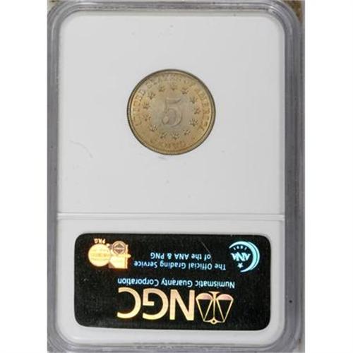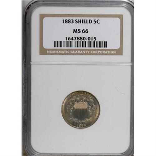 <B>1883 5C MS66 NGC.</B></I> In the final year for the design, Philadelphia struck fewer than 1.5 million Shield nickels before the change to Barber's Liberty-and-wreath devices. This boldly impressed Premium Gem displays lovely green-gold, peach, and champagne patina. NGC has graded 15 finer pieces (8/07).<BR><BR><B>Coin Engraver:</B> James B. Longacre<BR><BR><b>Shipping:</b> Coins & Currency (<a target="_blank" href="http://www.heritageauctions.com/common/shipping.php">view shipping information</a>)