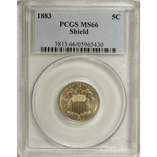 <B>1883 5C MS66 PCGS.</B></I> Delicate almond-gold patina invigorates this lustrous and precisely struck Premium Gem. An exceptional final-year type coin. PCGS has certified just nine pieces finer (2/07).<BR><BR><b>Shipping:</b> Coins & Currency (<a target="_blank" href="http://www.heritageauctions.com/common/shipping.php">view shipping information</a>)