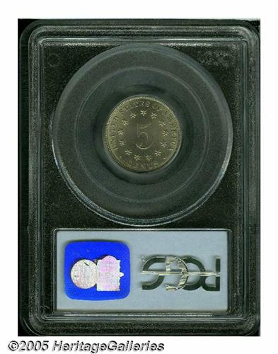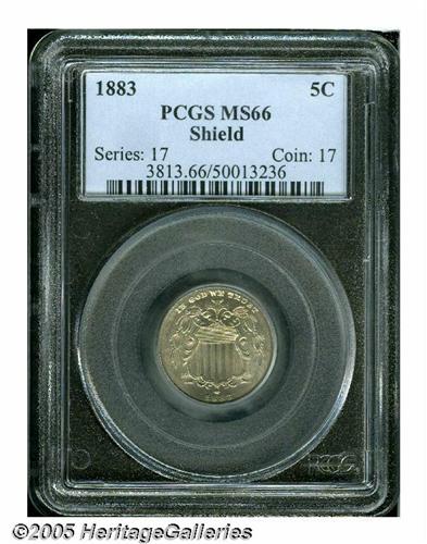 <B>1883<5C> MS66 PCGS.</B></I> Nickel-gray surfaces display radiant luster and faint speckles of gold patina visible under a glass. The design elements are sharply impressed, and the surfaces are seemingly well preserved. Some planchet anomalies are noted between the F and M of OF AMERICA. PCGS has seen only nine samples grading higher (3/05).
