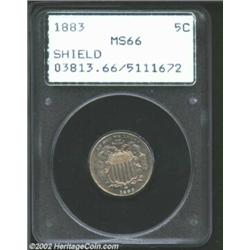 1883 5C MS66 PCGS. The margins have powder-blue patina, while the centers have green-gray color. Boldly struck aside from the left arrow feather. A lustrous and painstakingly preserved Gem. Important notice: We expect to be auctioning lots at the rate of 200-250 per hour. Sometimes eBay Premier live bid software cannot keep up with that pace, so we strongly recommend that you place a realistic proxy bid now as insurance to avoid disappointment. Also please note that all Heritage/CAA lots purchased through eBay Premier carry a 20% Buyer's Premium. Please make sure you read the Terms and Conditions.